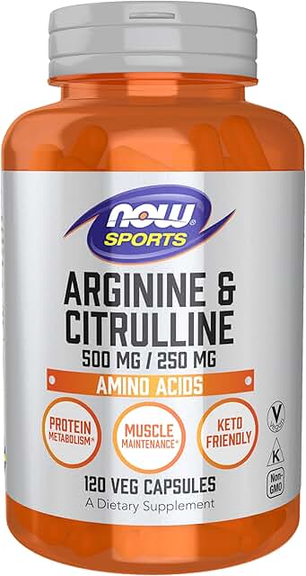NOW Sports’ Arginine & Citrulline (500mg/250mg) in 120 veg capsules supports protein metabolism and endurance. Non-GMO and vegan, these amino acids boost nitric oxide, aiding blood flow and performance for athletes during workouts.
